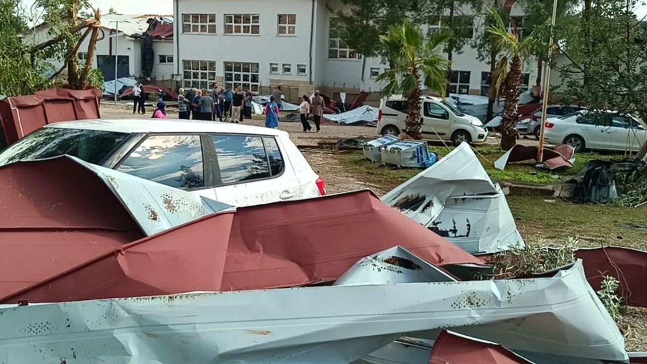 Adana'nın Kozan ilçesinde etkili olan sağanak ve fırtına nedeniyle uçan okul çatısı, park halindeki araçların üzerine düştü.