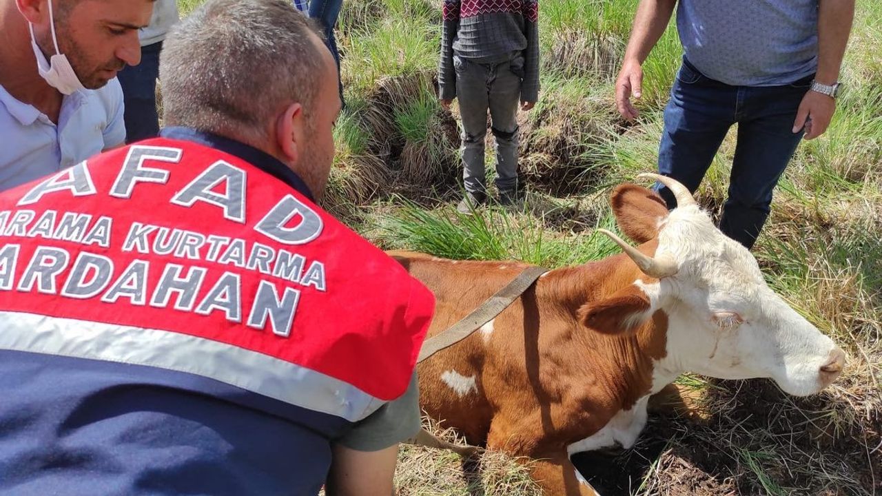 Ardahan'da kayalıklardan düşen büyükbaş hayvan, Afet ve Acil Durum Müdürlüğü (AFAD) ekiplerince kurtarıldı.