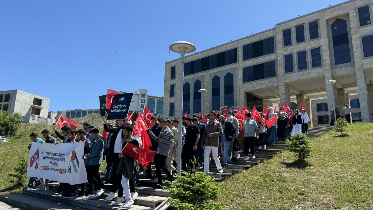 Türk ve Filistin bayrakları ile İsrail'i kınayan dövizler taşıyan öğrenciler, Gazze'yi destekleyen ve İsrail'i telin eden sloganlar atarak gölete kadar yürüdü.