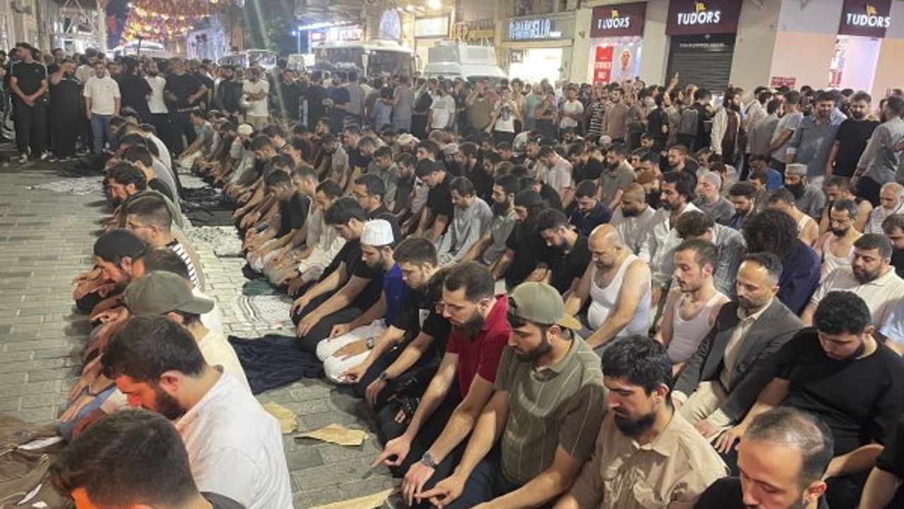 Cami önünde toplanan dernek üyeleri, "Peygambere hakaret cezasız kalamaz" sloganları atarak, "Hz. Muhammed'e can feda", "Özgürlük değil, inanca saldırı" yazılı pankart ve dövizler açtı.
