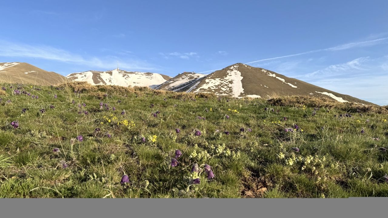 ERZURUM (AA) - Türkiye'nin önemli kış turizm merkezlerinden Erzurum'daki Palandöken Dağı, ilkbaharda açan mor ters lalelerle farklı güzelliğe büründü.