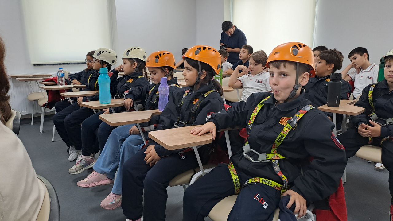 Güneşler Mahallesi'ndeki Büyükşehir Belediyesi Afet Eğitim Merkezi'ne öğretmen ve yöneticileri eşliğinde gelen çocuklar, afet türleri ve sonuçları hakkında bilgilendirildi, kurtarma halatından kayma ve sarkma, alevlere su sıkma, arama kurtarma köpeğini yönlendirme gibi pratik eğitimlere katıldı.