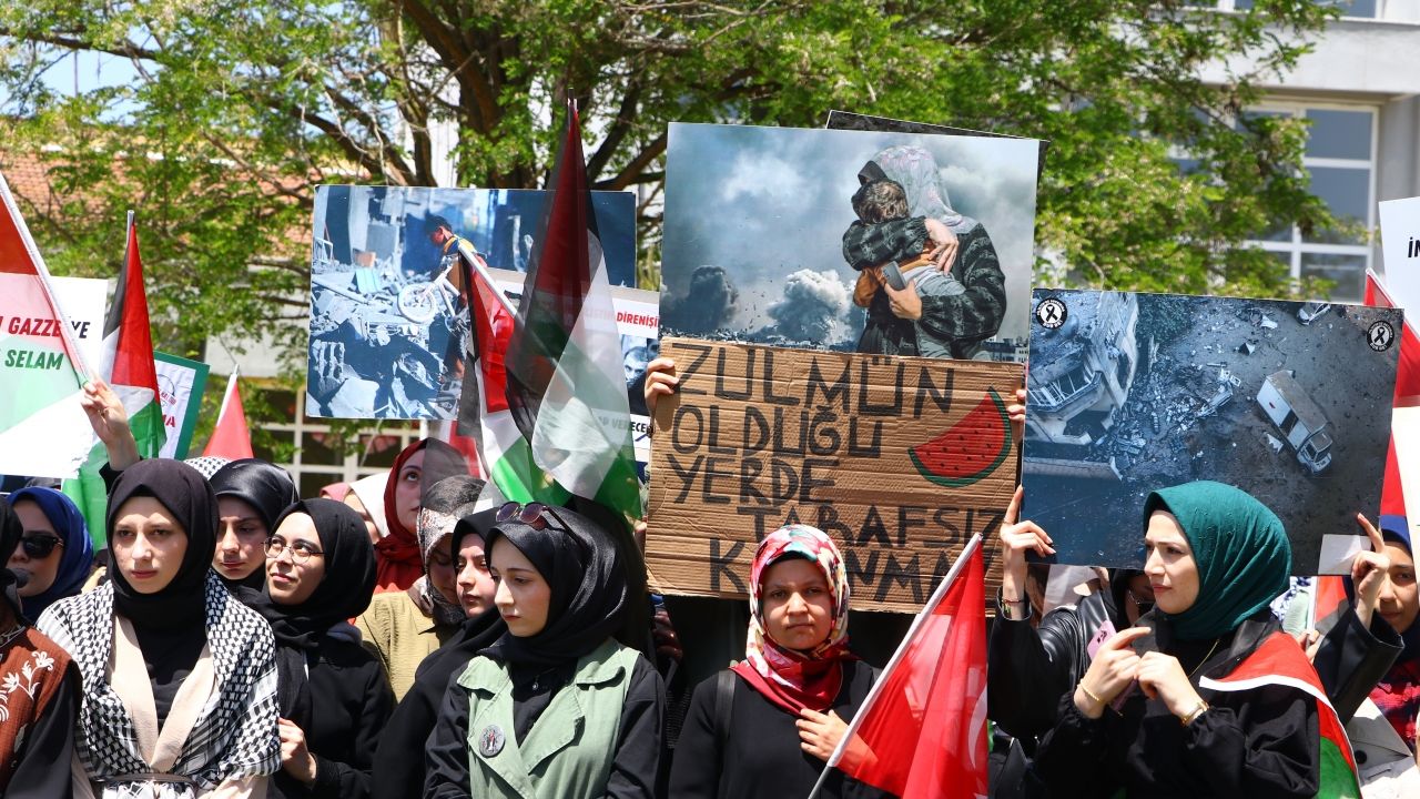 Üniversite yerleşkesindeki Tatbikat Camisi yanında toplanan grup, "İnsanı değil, insanlığı vuruyor zalim", "Zulmün olduğu yerde tarafsız kalınmaz", "Kampüslerden Gazze'ye direnişe bin selam", "Tüm uyuyanları uyandırmak için bir Gazze yeter" ve "Özgür Kudüs özgür Filistin" yazılı pankartlar açarak yürüyüşe geçti.